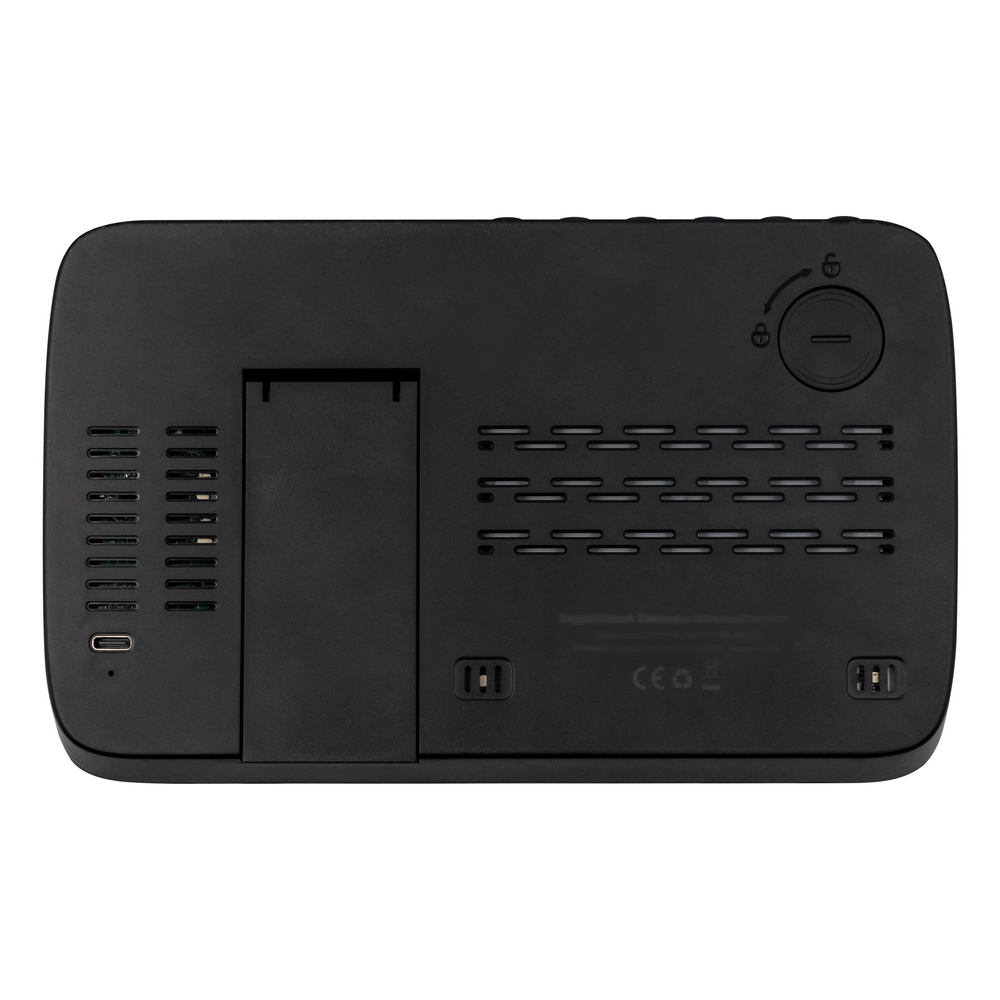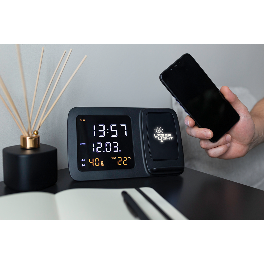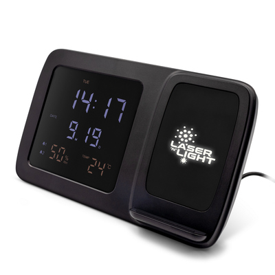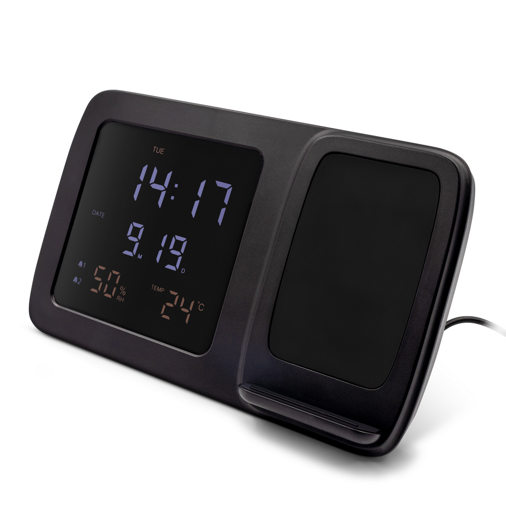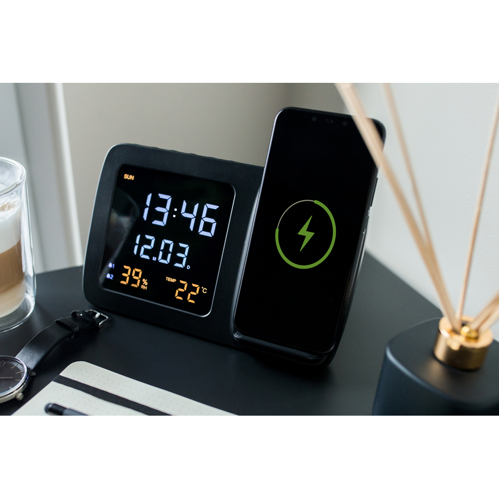 Wireless charger 5W-15W Exclusive Collection, integrated digital clock, functions: alarm, temperature and humidity information, time and date, works with devices with inductive charging function, backlight effect after engraving, USB-C cable included
